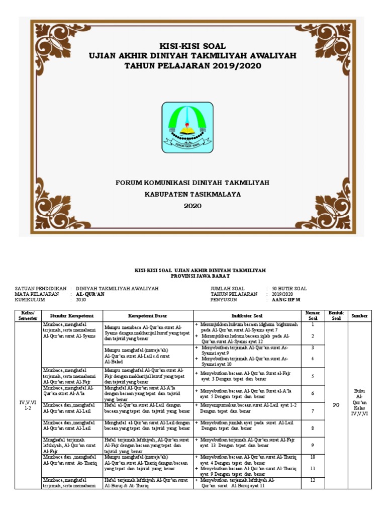 Kisi Kisi Ujian Madrasah Diniyah / Kisi Kisi Uas Pas Madrasah Aliyah Semester Gasal 2017 2018 Warta Madrasah - Silakan unduh filenya pada tautan di bawah ini!. السلام عليكم و رحمة الله و بركاته بسم الله و الحمد لله اللهم صلى على سيدنا محمد و على أله و صحبه أجمعين. Dalam upaya peningkatan kualitas output pendidikan di madrasah diniyah, insan diniyah terus berinovasi dan menggali potensi para santrinya. Silahkan baca artikel emis madin madrasah diniyah takmiliyah ini selengkapnya di maarif nu pecangaan. Ujian ini merupakan acuan pemberian ijazah madrasah diniyah takmiliyah bagi santri sebagai bukti kelulusan pendidikan madin sesuai dengan jenjang yang ditempuh. Silakan unduh filenya pada tautan di bawah ini!