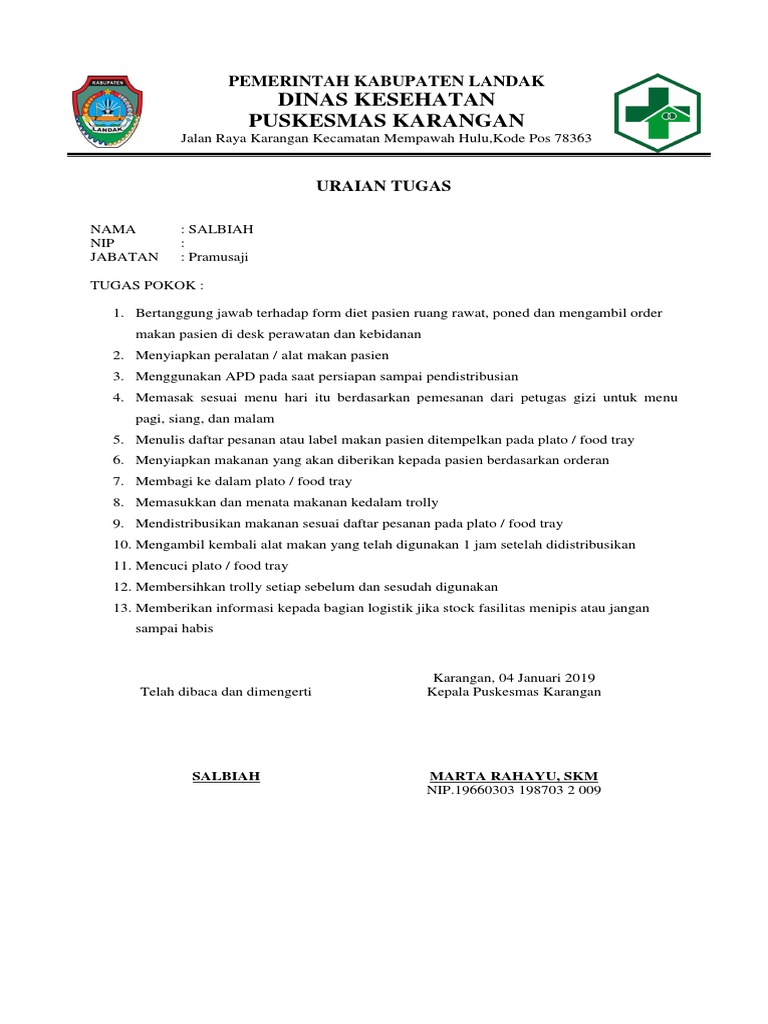 Uraian Tugas Kerja Petugas Dapur Pdf Txt from html.pdfcookie.com Pramusaji di instalasi gizi rs jiwa grahsia diy tahun 2019. Pengertian pramusaji serta fungsi dan kriterianya. 1.penyelenggaraan urusan umum, ketatausahaan, kepegawaian, kerumahtanggaan dan perlengkapan. 1) memberikan label pada makanan yang disajikan 2) memorsikan makanan untuk klien 3) mengambil makanan untuk klien atau konsumen. Istilah pramusaji dimaksudkan sebagai pengganti perkataan waiter / waitress dari bahasa inggris. Uraian tugas/job description adalah informasi tertulis yang menguraikan tugas dan tanggung jawab, kondisi. 2 pengertian pramusaji pramusaji adalah petugas restoran yang mempunyai tugas dan tanggung jawab melayani kebutuhan makan dan minum bagi pelanggan/tamu secara profesional.tugas dan tanggung jawab pramusaji adalah sebagai berikut: Rumah sakit mempunyai kekhususan yang lahir dari adanya hubungan yang terjadi antara medical staff ( kelompok dokter) dan administrator
